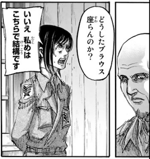 サシャは訓練兵時代にシャーディス教官に怒られていました。それがあったので、キース・シャーディスが座った時もどうした、座らんのかって言われて、いいよ、私もや、こちらで結構ですと言っています。